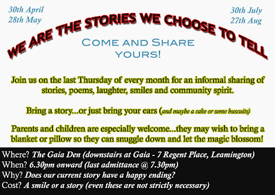 The lovely folk at Gaia have recently sent us this poster about a new storytelling evening they are hosting on the last Thursday of every month. Bit late notice for today, but the first one is tonight… Maybe see you there sometime!